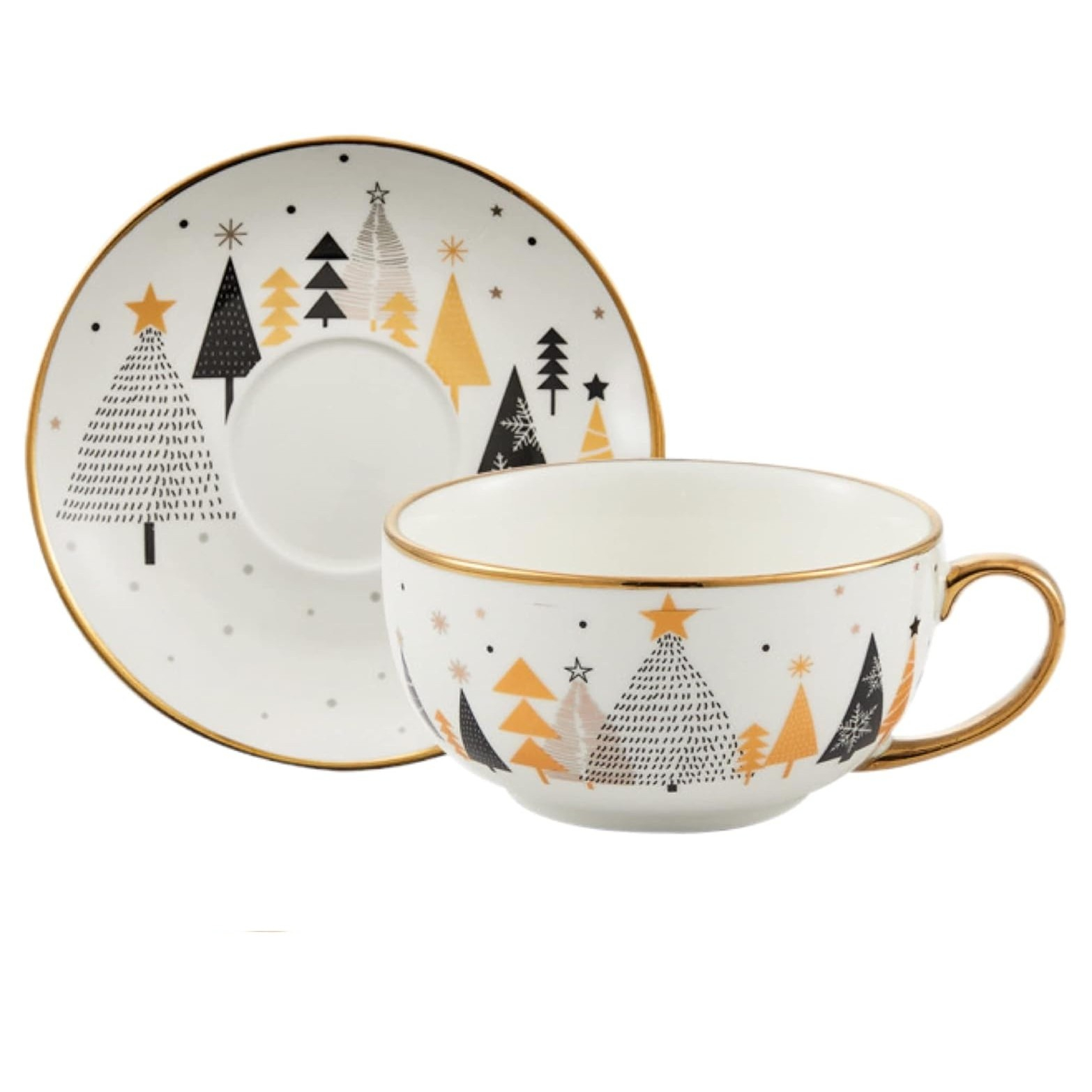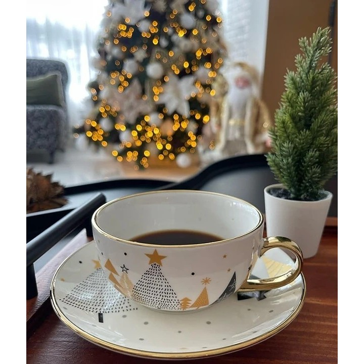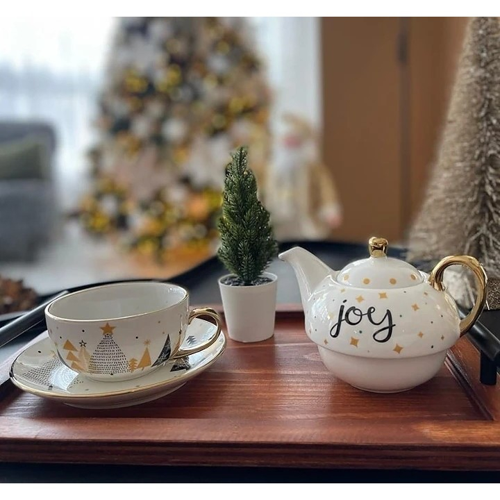 Ceainicul este gândit să se așeze perfect peste cană, economisind spațiu, iar farfuria completează setul pentru o experiență rafinată de servire a ceaiului. Designul festiv aduce o notă veselă și este ideal atât pentru uz personal, cât și pentru a fi oferit cadou de Crăciun sau alte ocazii speciale.