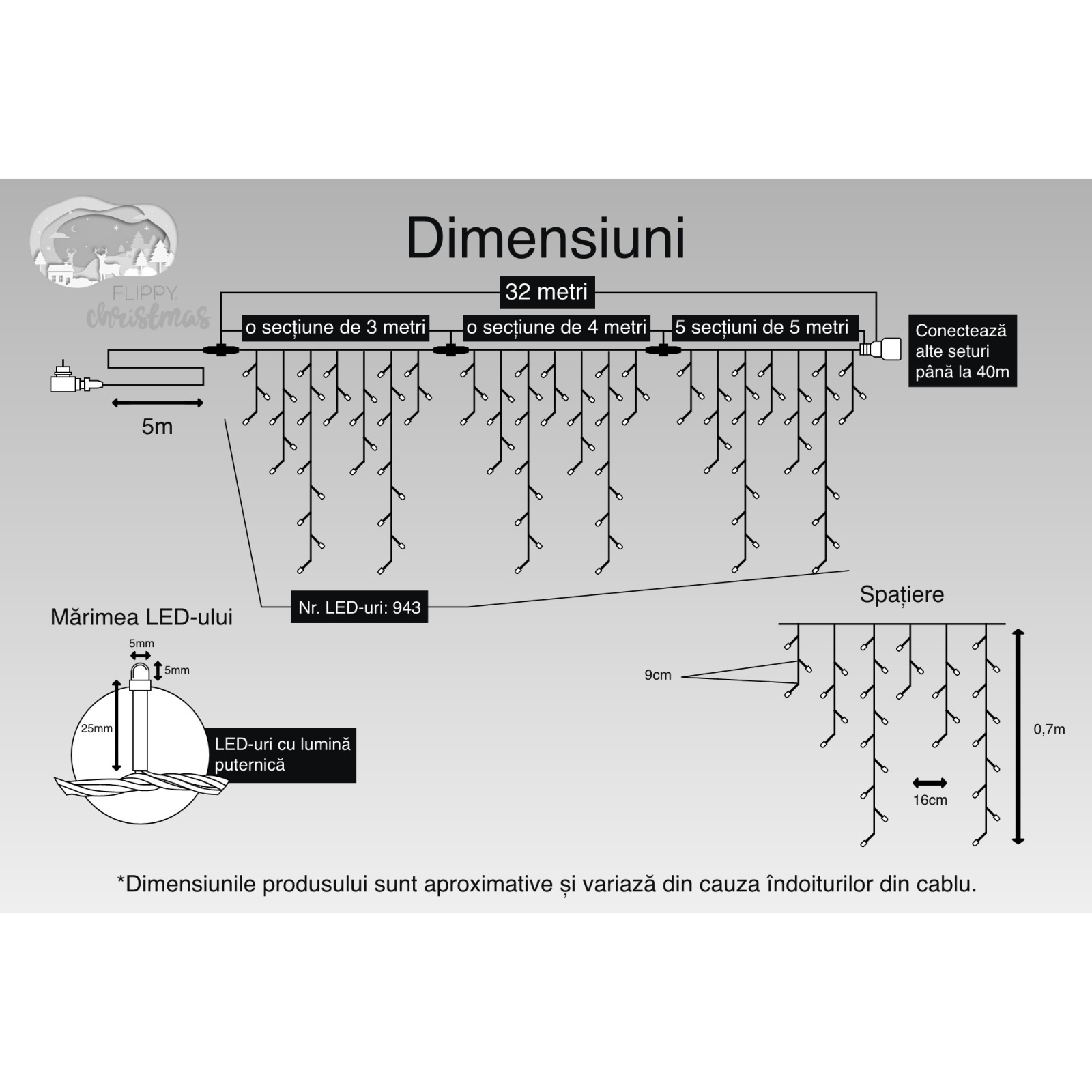 Instalatie Craciun, 32 m, 943 Led-uri ,Franjuri, Alb rece, Flash, Transformator, Interconectabila, Prelungitor 5 m inclus, Fir Negru, OEM