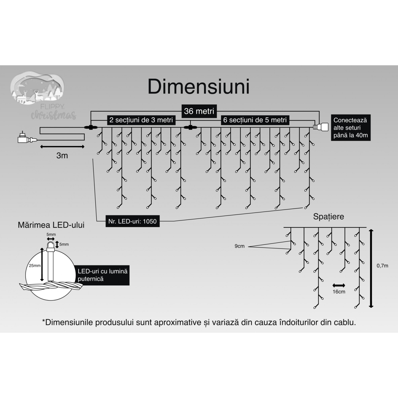 Suprafata luminoasa are un total de 36 m metri. Lungimea prelungitorului este de 3 m metri. Ofera posibilitatea de a suspenda ghirlanda astfel incat sa poata fi ascuns cablul de alimentare atunci cand este conectat la priza.