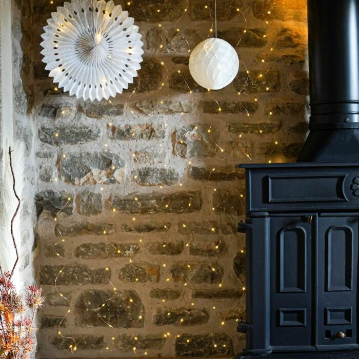 Instalatia luminoasa este de tip franjuri si are 143 LED-uri alb cald, avand o lungime de 5 m, cu fir de culoarea cuprului realizat dintr-un plastic anti-inghet, iar firele electrice sunt fabricate din cupru.